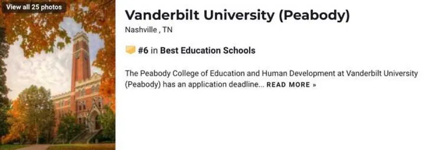 范德堡大学的校园规模相对较小,校区所在地Nashville也是非学府型城市。尽管Vandy的US排名排在第14位、教育学专业排名第六位,但在QS排名中Vandy在200名之外,这对于将来打算回国进入大学企业工作或在一线城市落户的同学来说是一个极大的劣势。当然,Peabody的专业实力还是足够强大的,它更加适合想继续走研究路线,或者想在海外长足发展的同学。