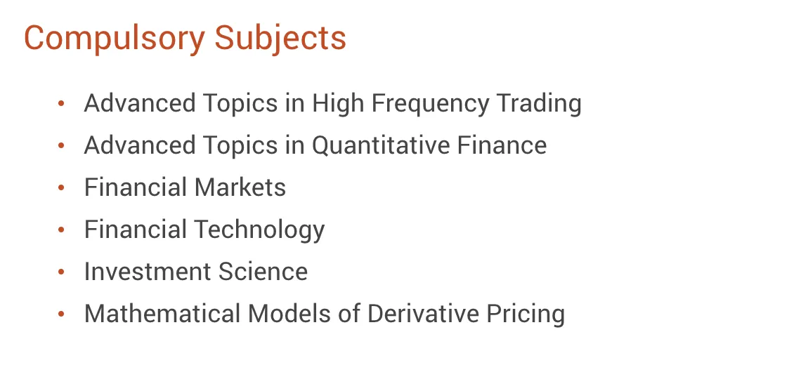 本课程旨在提供以课程为基础的深入培训,包括定量和分析方法、建模技术、金融概念和编程技能,使毕业生能够在不同的市场环境下,以专业的方式做出具有竞争力的决策。