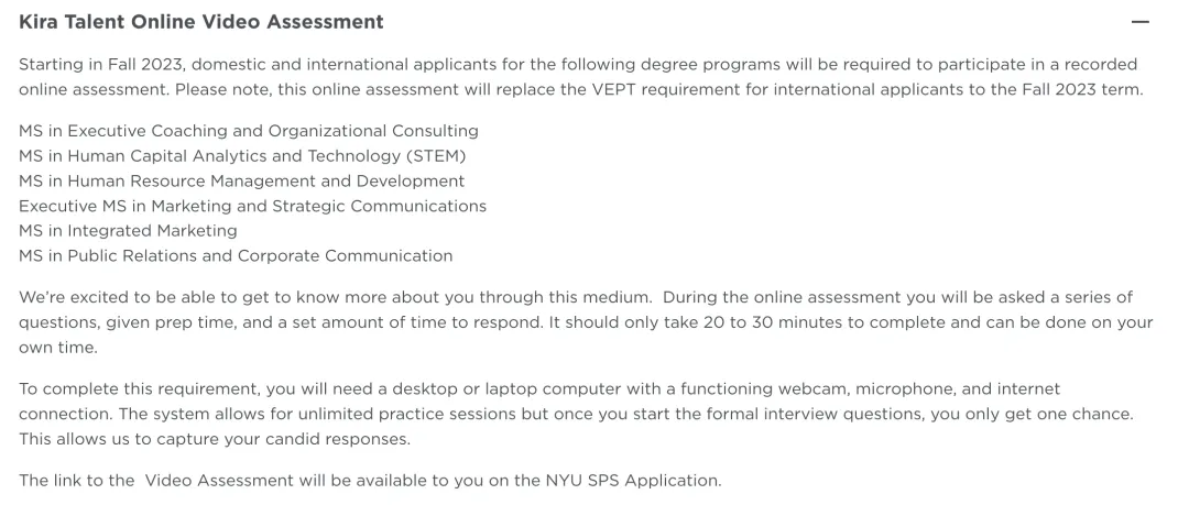 在23Fall的申请中,纽大SPS这些专业就已然悄悄提升了难度,不但增加了Kira面试环节,并且Kira面试还取代了国际申请者的VEPT要求。