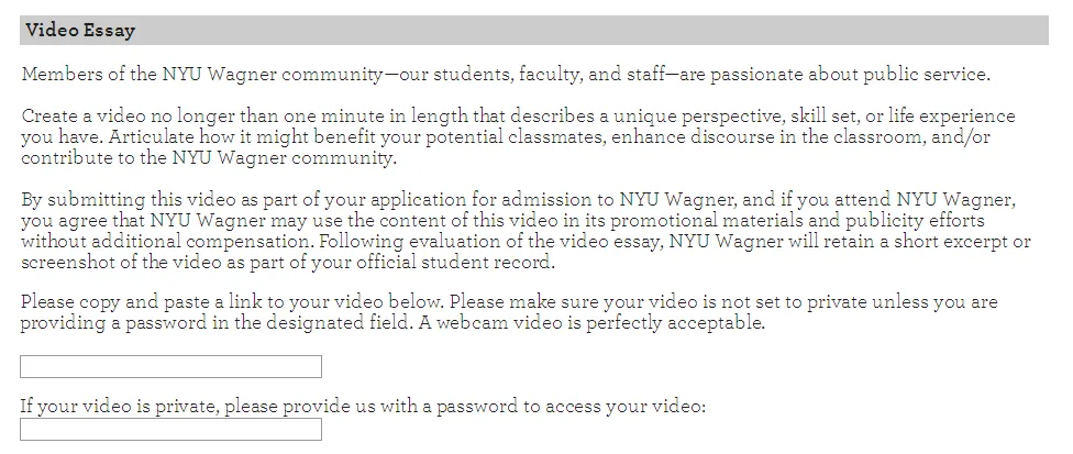 Video Essay常见有两种形式。一种是要求申请者自己录制一段视频,在视频中用英文回答学校提出的一些问题,然后把录制好的视频上传给学校。比如NYU的MPS项目,会要求申请者在提交网申之前完成Video Essay的录制和上传,申请者可以看到题目要求提前准备好稿子,再录视频上传。