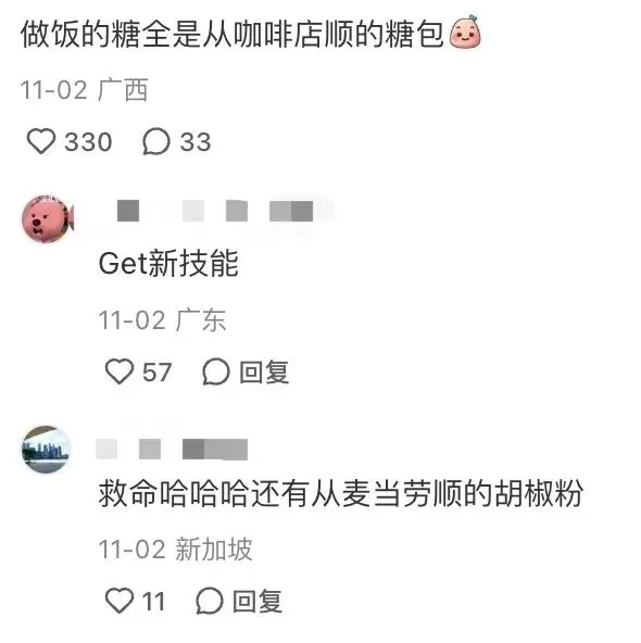 做饭的糖是咖啡店的,胡椒是麦当劳顺来的。