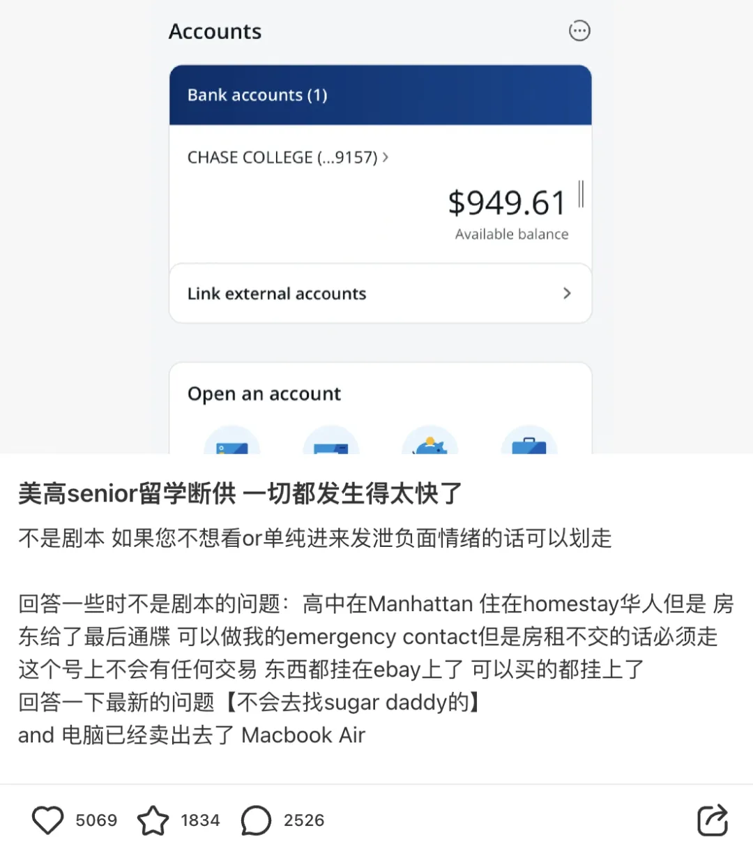 美高12年级突然面临留学断供,家里东拼西凑也只能凑出1000美金。之后的美本申请,下月的homestay房租,都是问题。