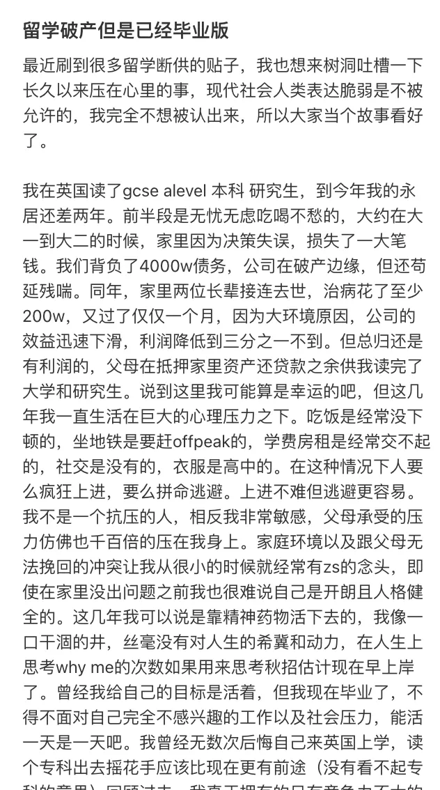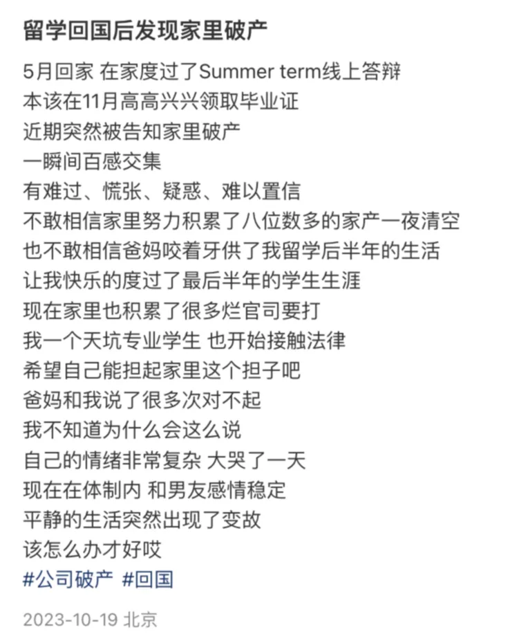 毕业回国后发现家里破产的,已经算是不幸中的万幸。毕竟有学历有工作,还可以自食其力,但也要面对阶层滑落的落差感。