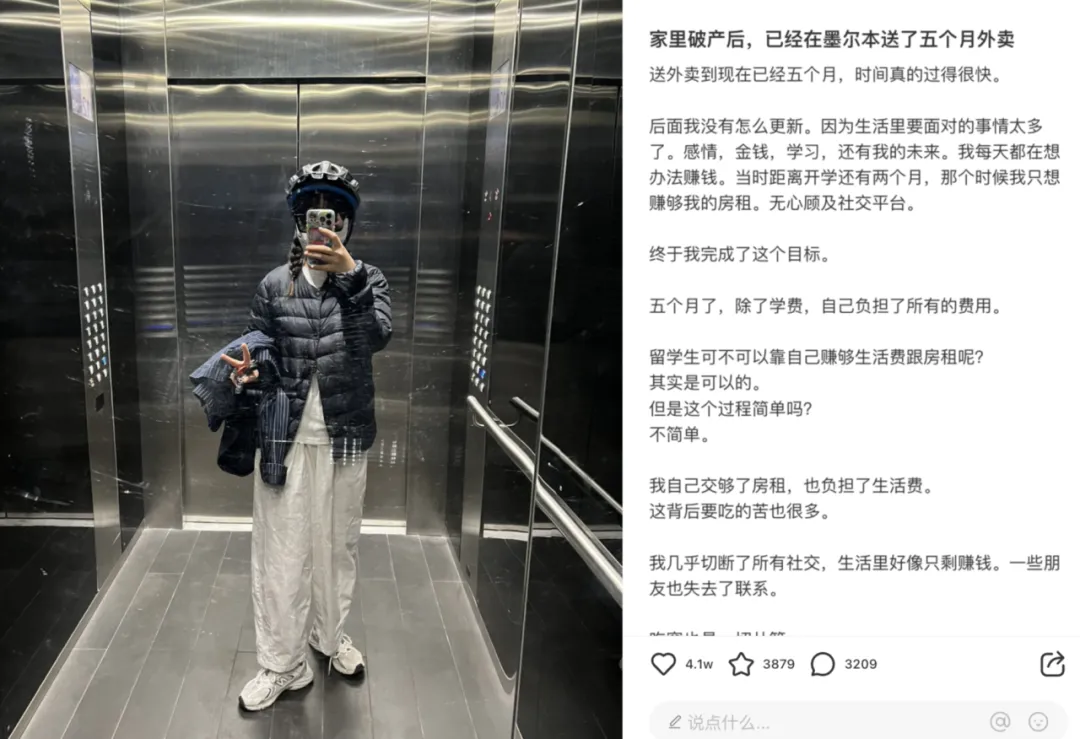 澳洲留学的小恩,同样因为家里破产开始送外卖,每天骑着电动车送十几个小时。