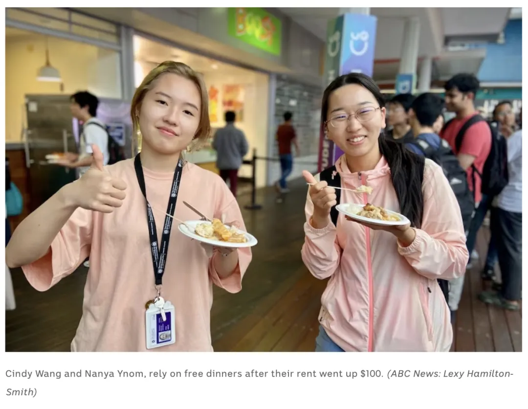 中国留学生也加入了领取救济食物的队伍。她们的房租是每周400澳元,比去年涨了100块。物价飞涨之下,免费食物让她们稍感心安:能省一点是一点。