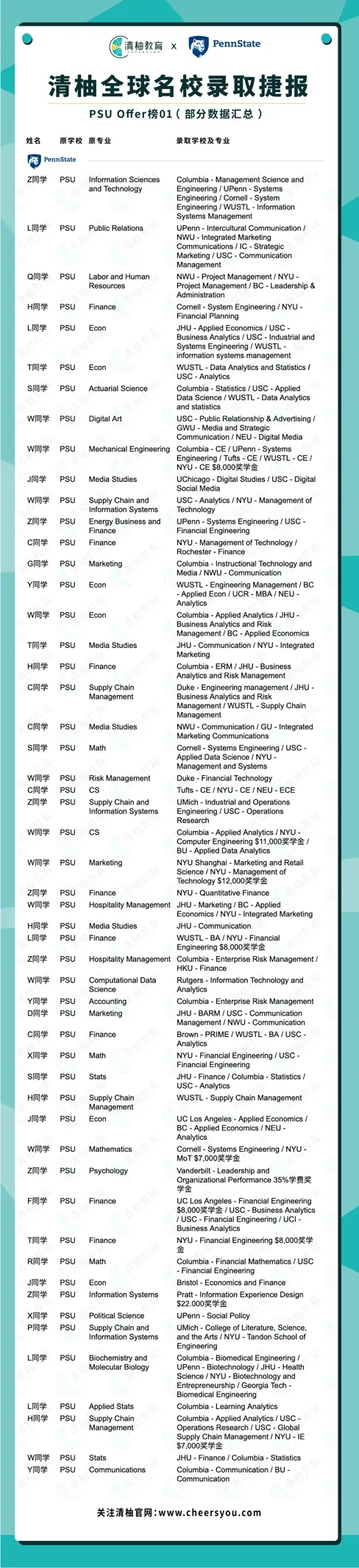 在清柚教育的帮助下,希望看到PSU优秀学子们继续深造,走进更高水平的学术殿堂,探索更广阔的学术和职业可能性,实现自己的潜力和抱负。