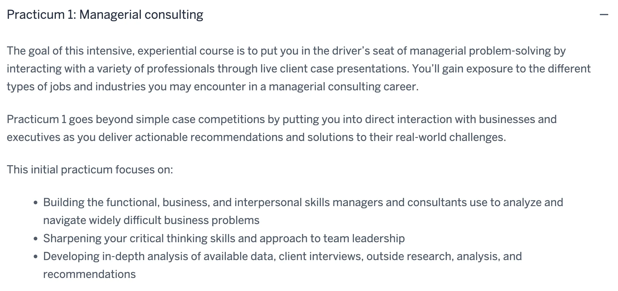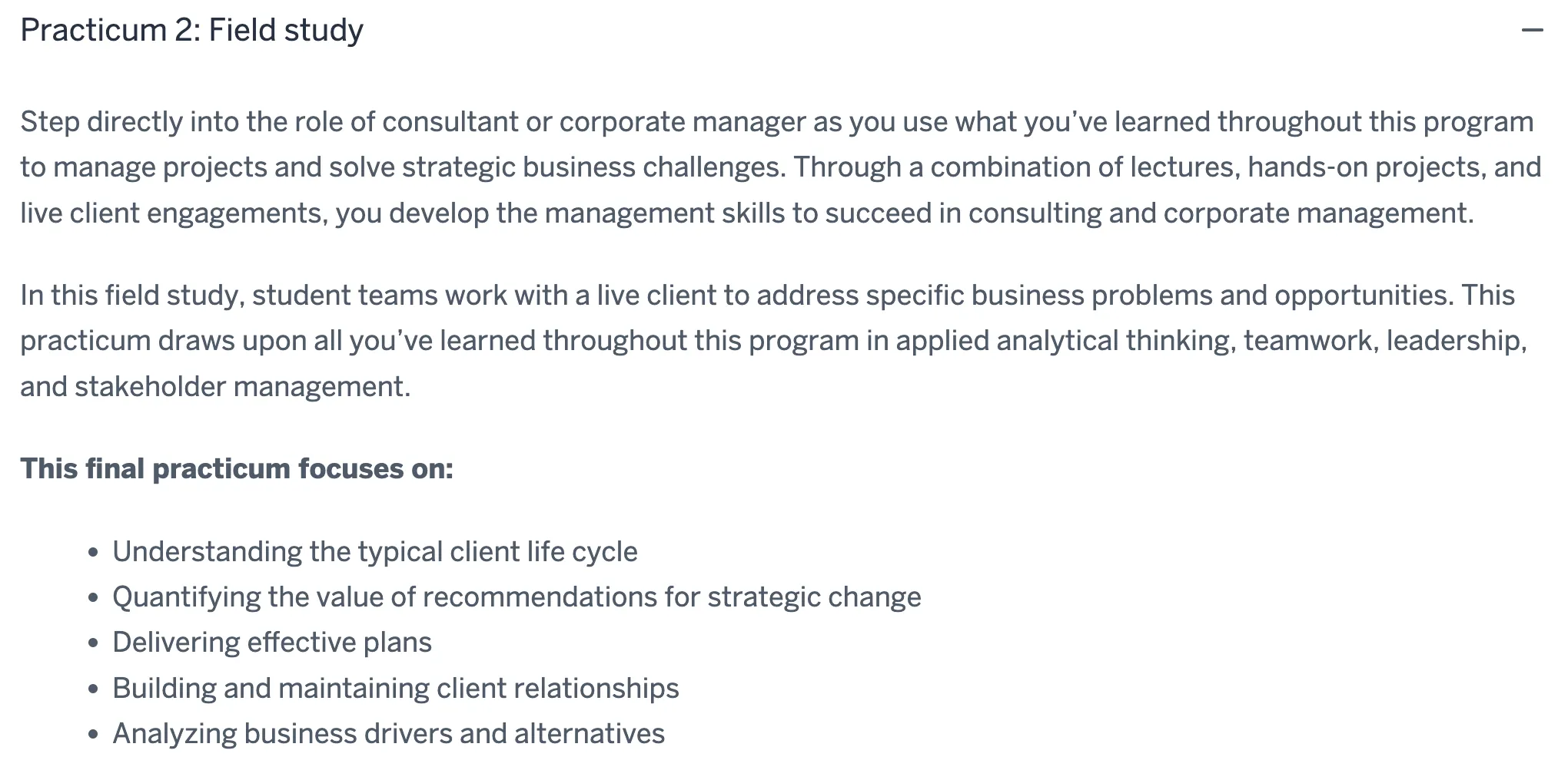 • 在第一学期参加实习1:咨询管理(Practicum 1: Managerial Consulting)