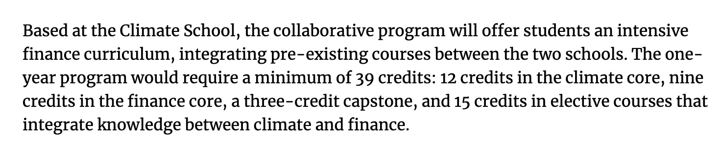 该一年制项目至少需要39个学分:气候核心课程12个学分,金融核心课程9个学分,3个学分的顶峰课程,以及15个学分的选修课程,这些选修课程整合了气候和金融方面的知识。课程设置涵盖了气候科学的基础知识、气候政策与经济学、绿色金融产品设计、碳市场与交易、以及气候风险管理等。学生将通过案例研究、模拟交易和实地考察等方式,深入了解气候金融的实际应用。此外,项目还提供了一系列选修课程,让学生可以根据自己的兴趣和职业规划,深入探索特定领域,如可再生能源投资、气候变化适应策略等。