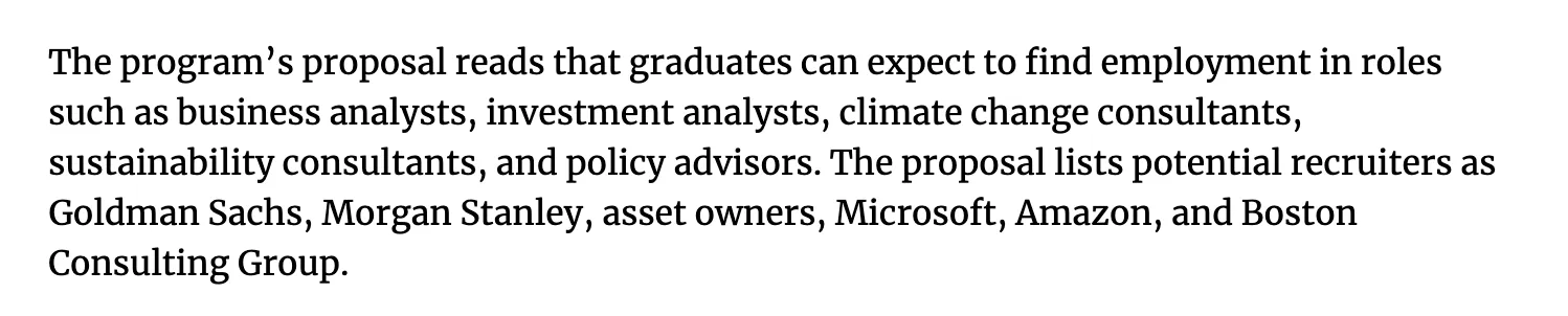 毕业生将具备在金融、咨询、政府和非政府组织等领域工作的能力。他们可以在投资银行、资产管理公司、保险公司、绿色基金、国际组织和政府部门等机构中担任气候风险分析师、绿色金融顾问、可持续投资经理等职位。随着全球对气候变化问题的关注日益增加,气候金融专业的毕业生需求量也在不断上升的行业中,他们将成为推动经济向低碳和可持续发展转型的关键力量。