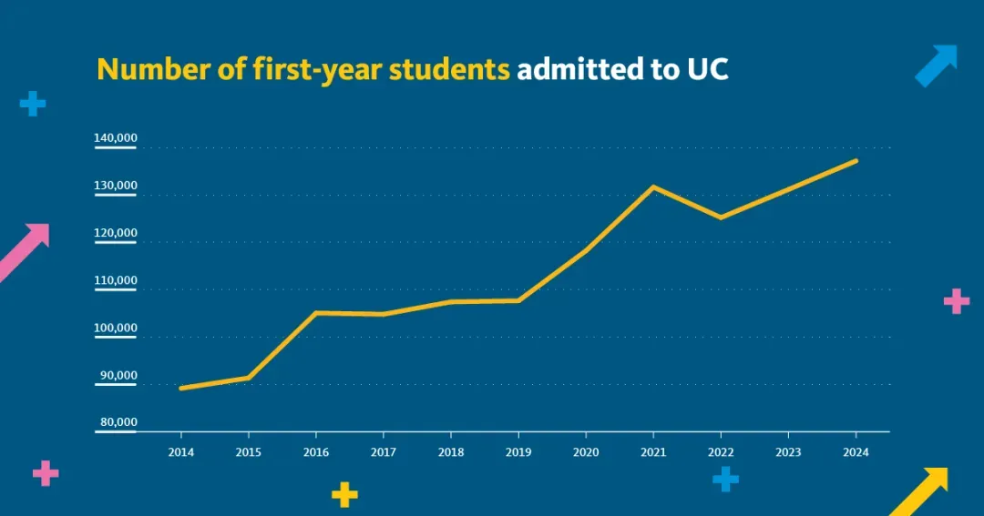 UC公布24Fall录取数据!加州大学新生录取量创史高,社区大学转学录取率猛增8%!
