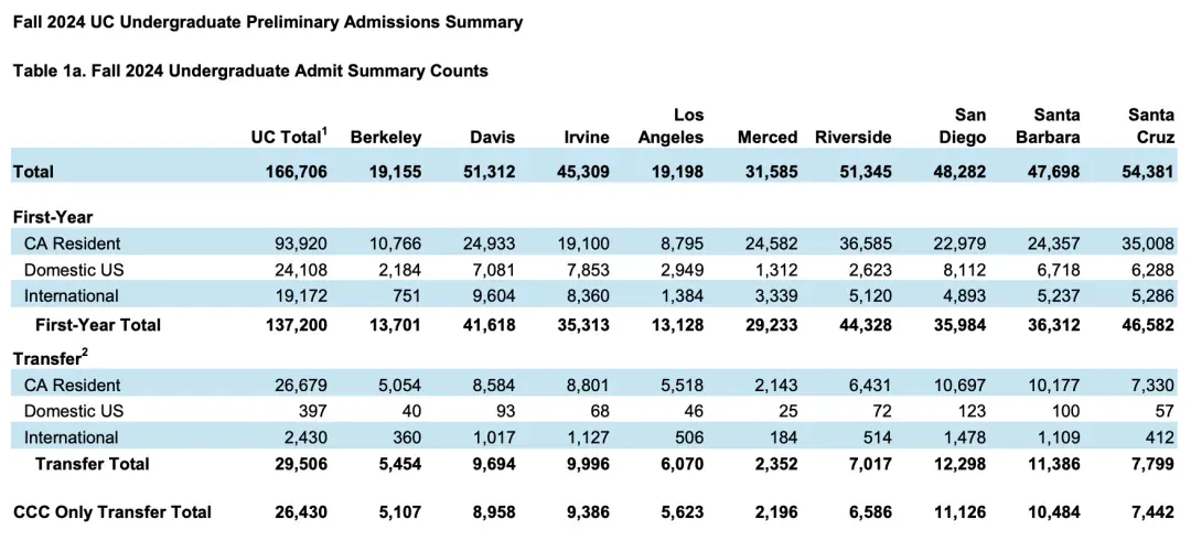 24Fall共有166,706名学生被UC九校录取,其中包括137,200名新生Freshman和29,506名转学生。