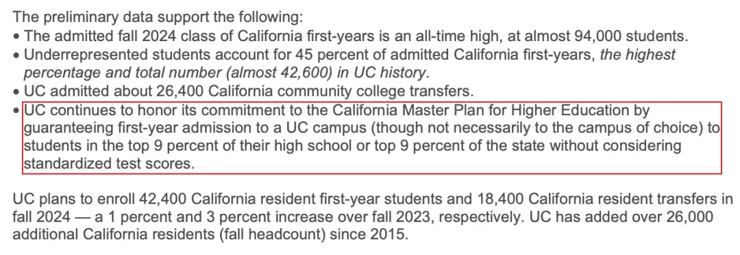 加州大学系统今年延续之前对加州高等教育主计划的承诺,在不考虑标准化考试成绩的情况下,保证高中前9%或者本州前9%的学生进入加州大学校园(尽管不一定是所选择的分校)。
