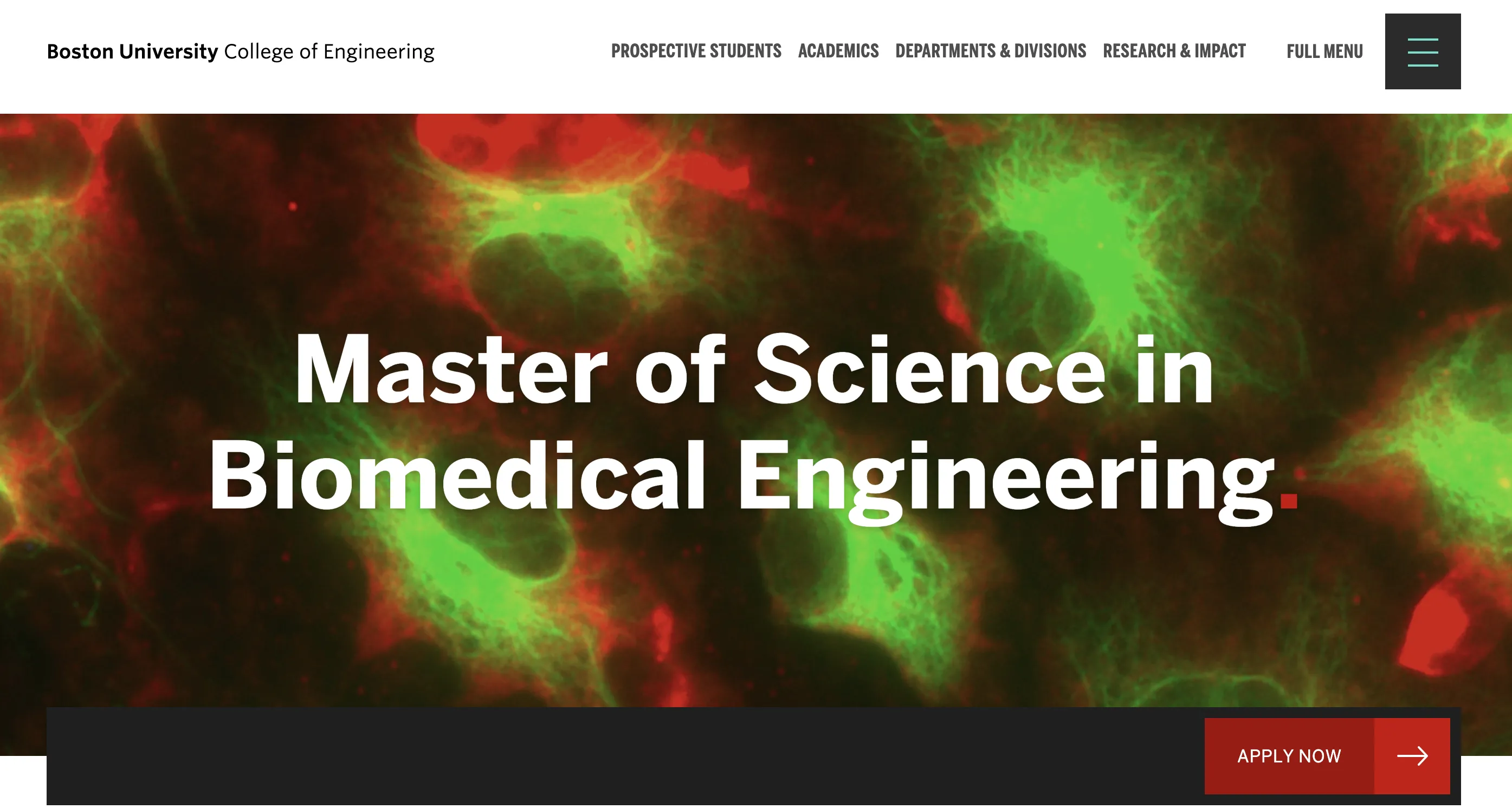 波士顿大学生物医学工程硕士(Master of Science in Biomedical Engineering)隶属于工程学院生物医学工程系,是专为非传统工程背景学生设计的跨学科项目。项目结合波士顿大学在医学研究(如波士顿医学中心合作)与工程技术的优势,培养能够解决医疗健康领域复杂问题的复合型人才。