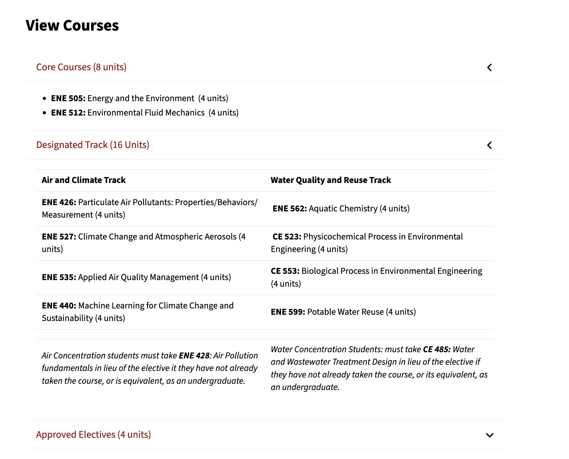 环境工程硕士项目要求学生完成28个学分的研究生课程,课程内容涵盖环境工程的多个核心领域。学生需与学术顾问共同制定个人学习计划,以确保课程选择符合个人职业目标和学术兴趣。