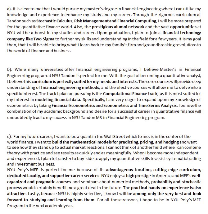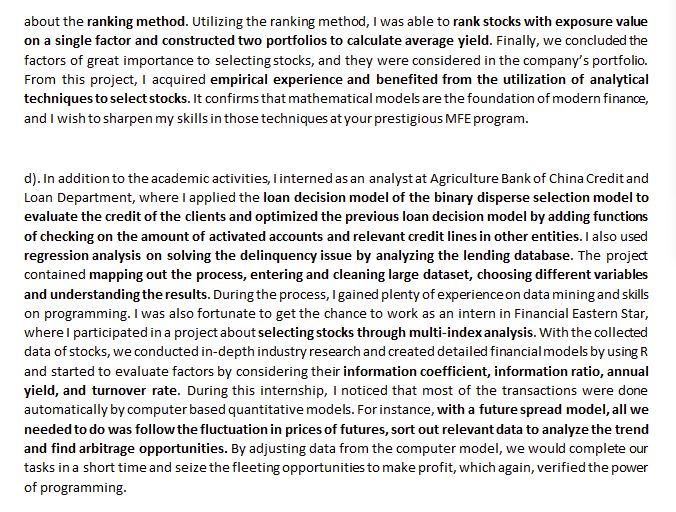 如果学生和学校有渊源当然要写;没有渊源的话可以从项目官方网站上找那种技术性强的课程介绍写在这里,比如stochastic calculus,各种option pricing,各种quantitative portfolio management等等。短期目标写进大金融机构比较实际,可以加上考CFA,FRM各种证书啥的,未来长远打算可以写改变中国的金融环境之类。这部分客套话相比之前不太重要,如果某部分特别长也可以分为两段。