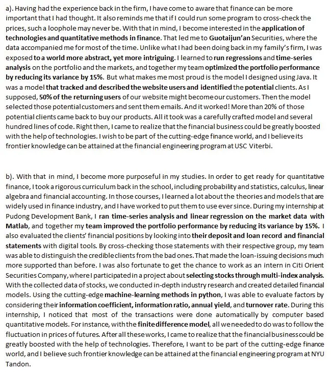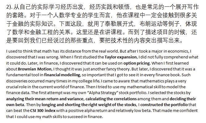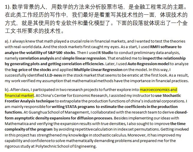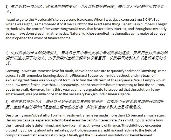 一个一篇好的文书开头应该是引人入胜,同时能体现出申请者特点的。申请者的背景、经历是多种多样的,那么自然,一篇好的金工文书开头应该也是很多样的。幸运的是,多数金工申请者的背景都有相似之处,例如他们的本科专业多为理工科,实习或工作经历多偏重投行、基金的量化部门等等,这样利用这些相同点,我们写作文书的开头方式就有迹可循。那么现在,我们从以往的文书中摘取一些内容,并加上一些分析,来帮助大家理解金融类文书的开头方式。