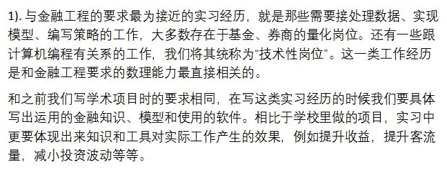 金融工程作为一个工作导向的硕士,偏好本科时有丰富的相关实习经历(投行券商等)的申请者。申请者可以去银行,基金公司,证券公司,金融公司的量化部、投资部、研究部、风险管理部做一些量化,策略相关的实习,做交易员也可以。