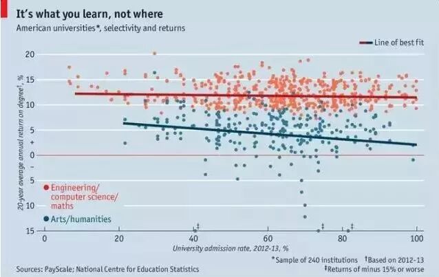 《The Economist》曾做过一个关于美国大学选择与回报的调查研究。大数据表明:从未来的收入水平来看,“学什么专业”,比“在哪里学”更重要。