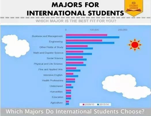从表中数据我们可以看到商业/管理,工程和数学/电脑科技专业(其他专业依次为社会科学、生命科学、艺术类、英语、健康、人文、教育和农学)是国际学生选择最多的3个专业,一半以上的国际学生都会选择这3个专业之中的一个。
