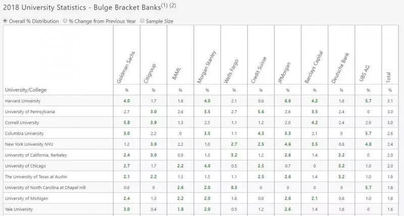 (WSO总结的华尔街在美国各高校招聘情况统计,完整表格可登陆www.wallstreetoasis.com查看)