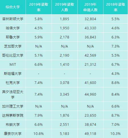 以下是部分名校最新公布的2019年录取率,以及2018年录取率对比: