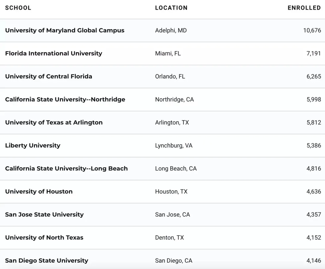 下图为U.S. News 2021转学生数量最多的美国大学部分排名: