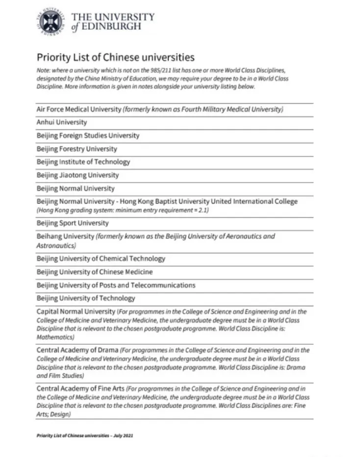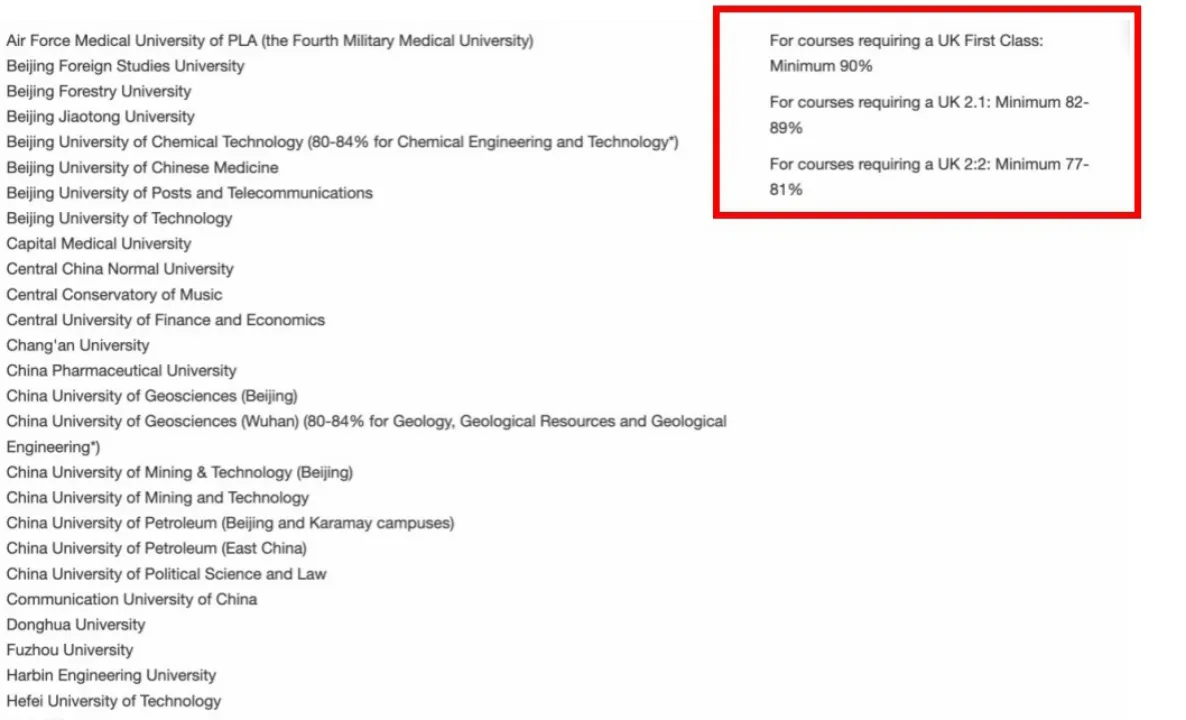 爱丁堡大学给出了详细的中国院校清单,如果命中这个清单的学校,AF这个项目的要求是: