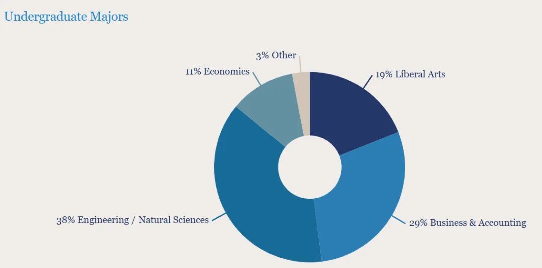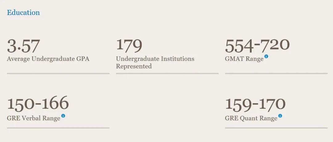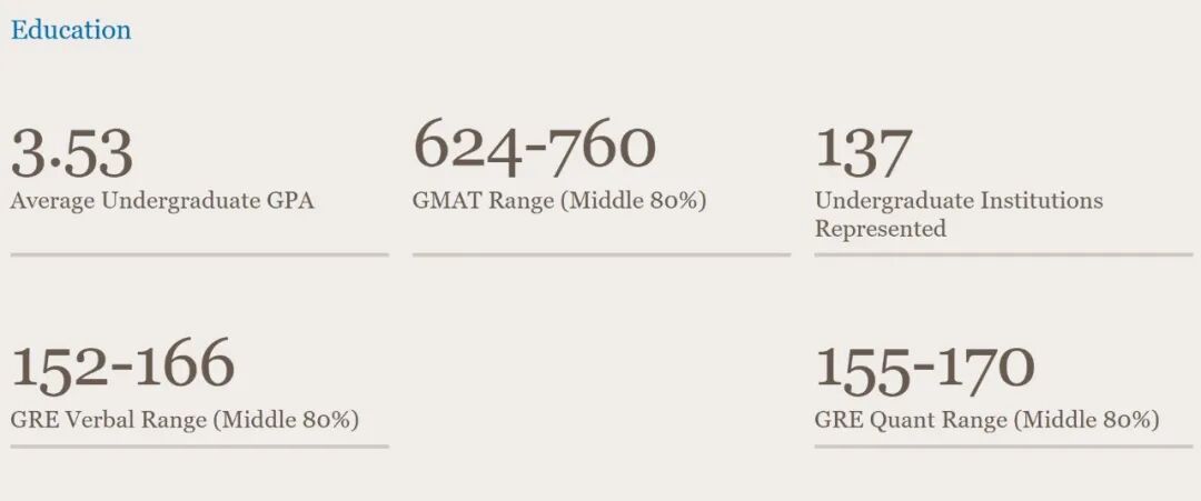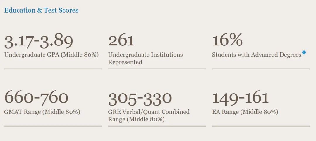 MBA项目录取学生的80%GPA范围为3.17-3.89,本科专业多为工程学和自然科学。MBA项目非常看中工作经验,学生的平均工作时间为6年,行业背景多为金融、咨询以及科技行业。