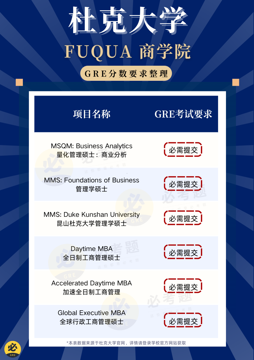 总结来看,杜克大学Fuqua管理学院所有项目都要求提交GRE成绩!